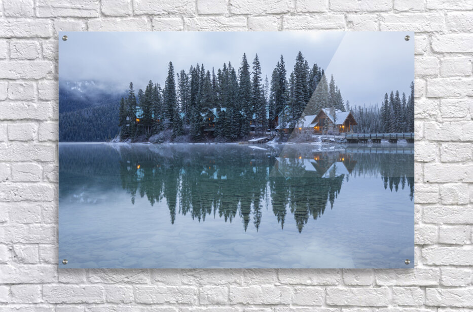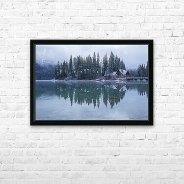 Misty Emerald Lake Chalet reflections Frame print